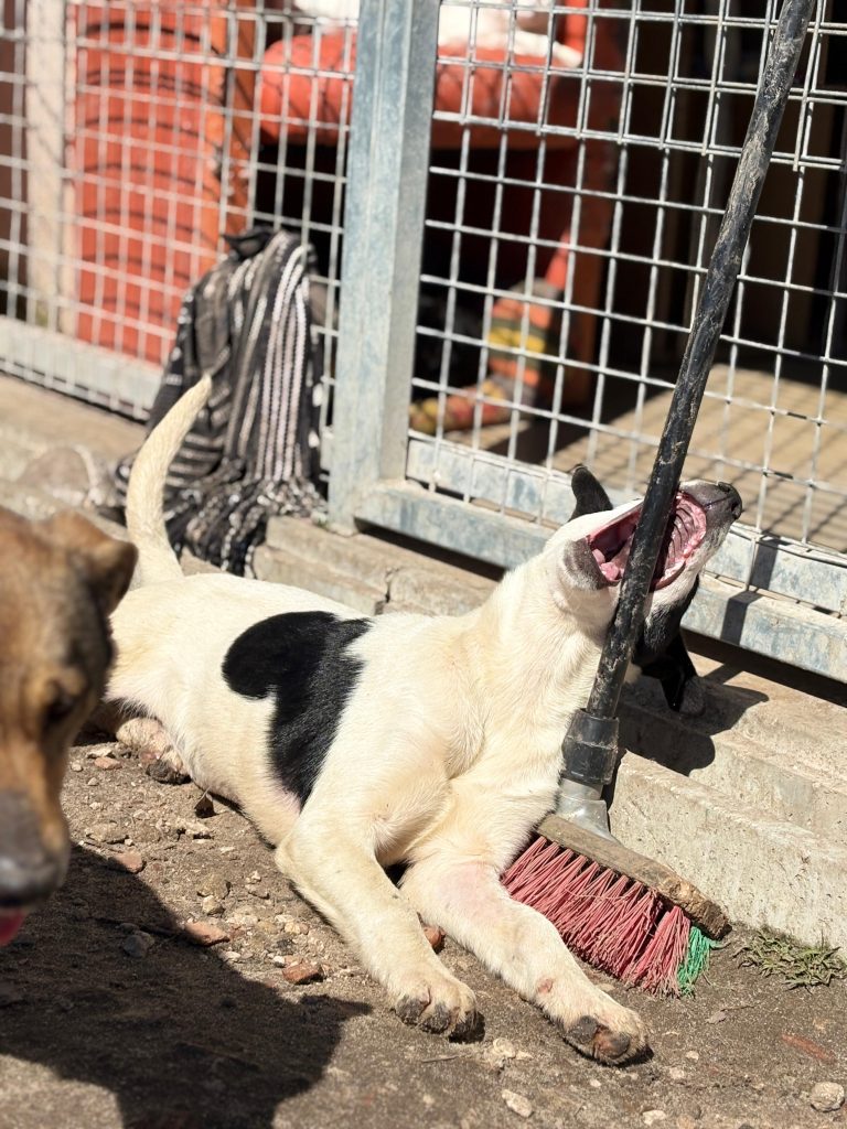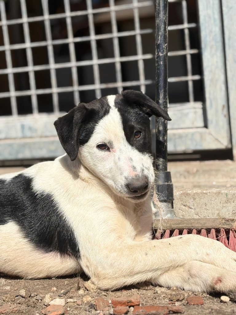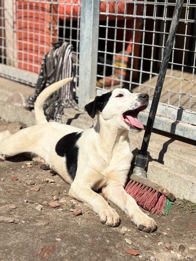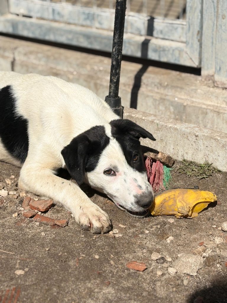 Hun ankom sammen med sine to søskende, som også befinder sig på shelteret. Hun er lige som sine søskende alderssvarende i adfærd, hvilket betyder fyldt med energi, leg, nysgerrighed og ægte hvalpeballade!