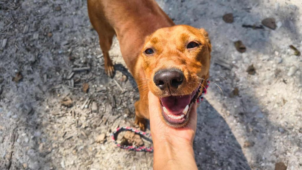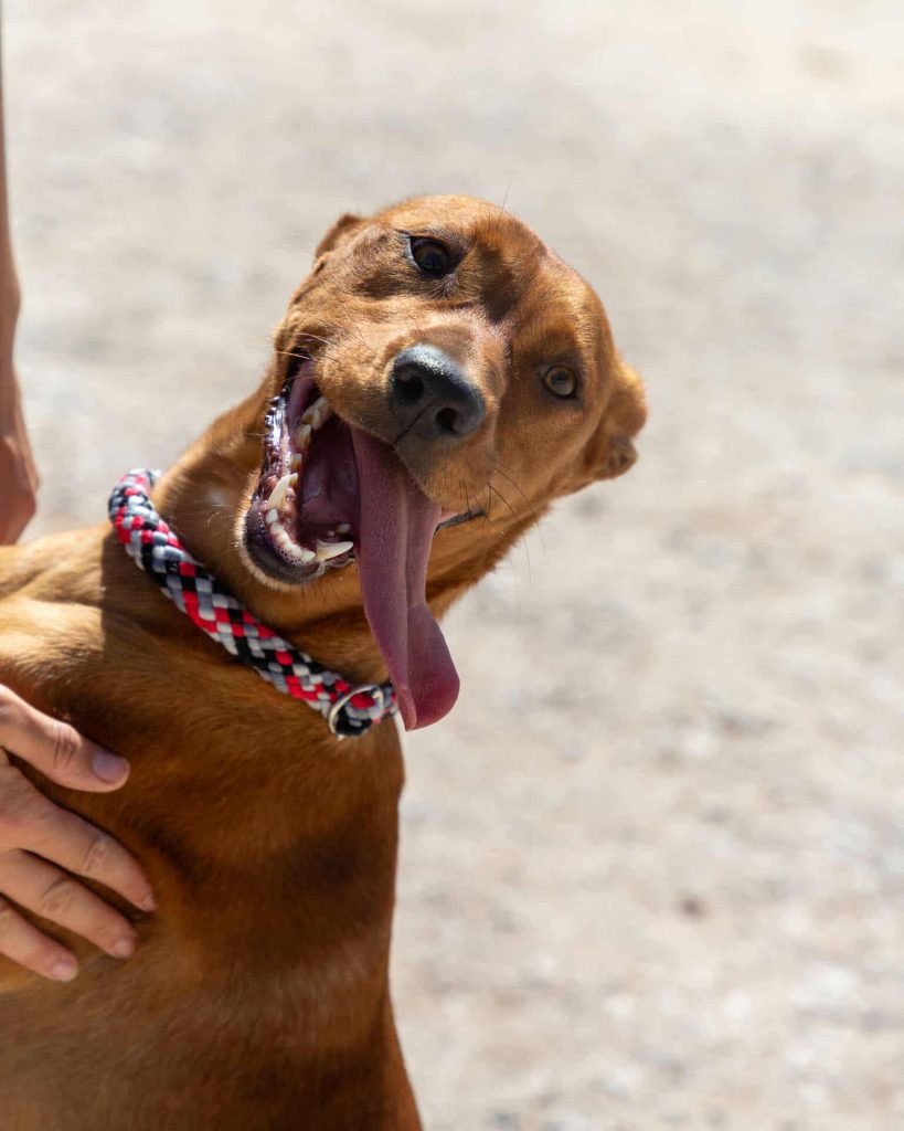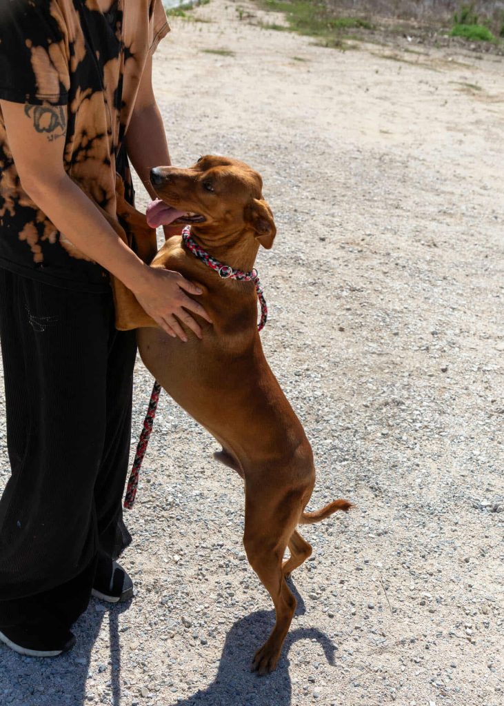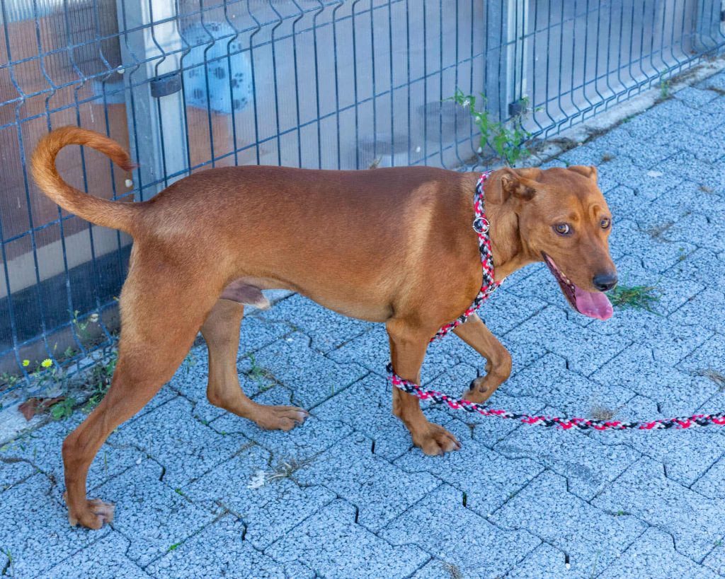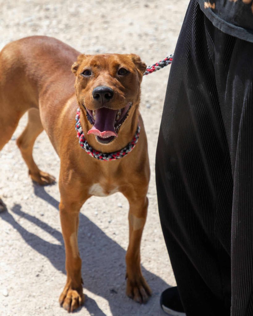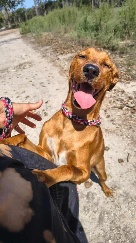 På shelteret kalder de ham jordbær-Maluma 🍓, fordi de frivillige fandt ham (formodentlig forladt) ved siden af drivhuse med jordbær i. Han var ikke svær at overtale til at komme med dem, da han er en utrolig menneske-glad og nyder at være i centrum.
